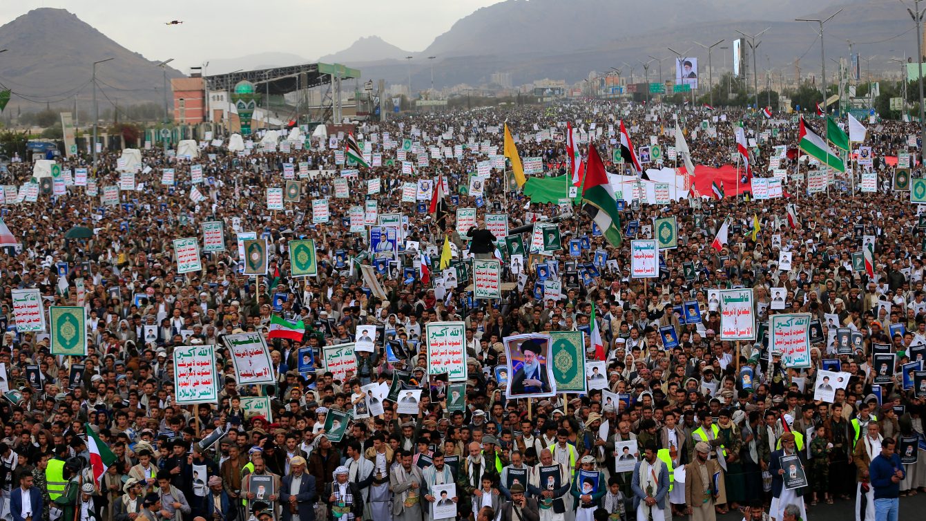 Demonstrators rally in Sanaa in solidarity with Iran and Lebanon
